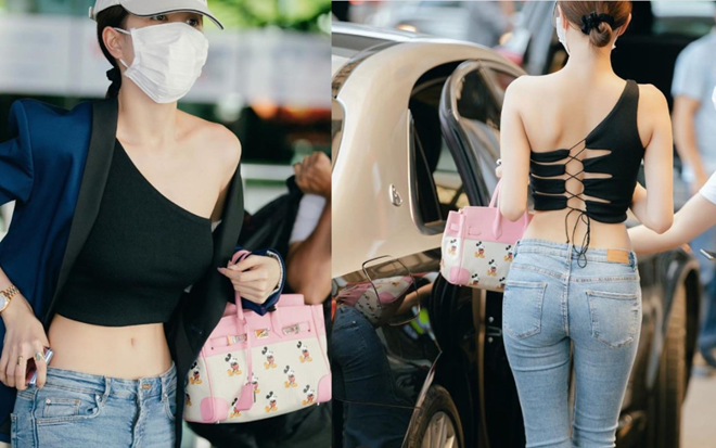 Dù bịt khẩu trang kín mít nhưng gu thời trang sân bay của Ngọc Trinh vẫn thu hút công chúng khi người đẹp mix kiểu áo lệch vai crotop dây chằng chịt với skinny jeans đi kèm là túi xách Mickey Mouse nhí nhảnh.![]() |